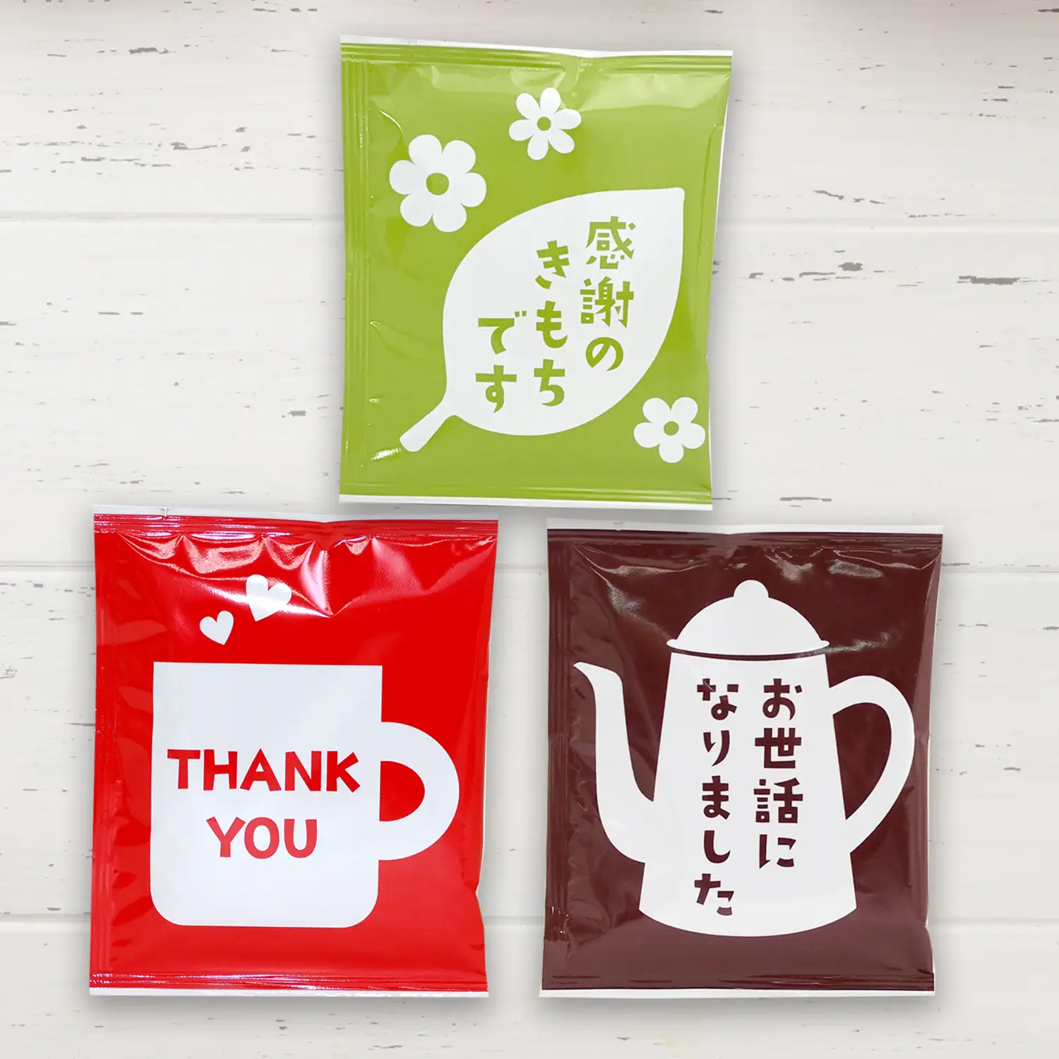 「お世話になりました」「THANK YOU」「感謝のきもちです」… ビジネスシーンや、お友達とのやりとりで、ちょっと伝えたい時の定番のメッセージ。甘いお菓子もいいけれど、コーヒーで気持ちを伝えたら、小さなサプライズができるかも。価格もプチプライスで、イベントでのお配りなどにもオススメです。